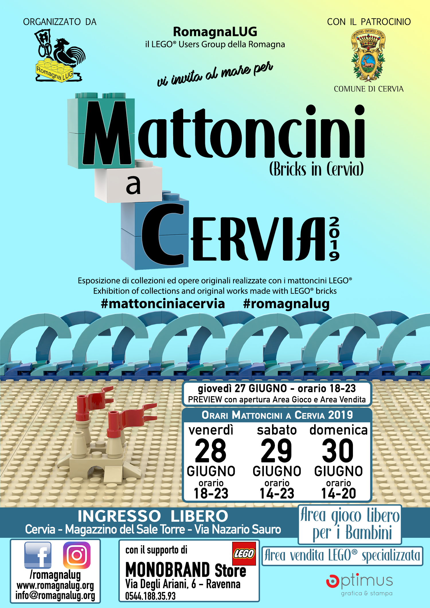 Per il quarto anno consecutivo, e dopo i grandi successi di visitatori d elle passate edizioni, anche quest’anno ROMAGNA LUG, con il Patrocinio d el Comune di Cervia, è lieta di invitarvi a MATTONCINI A CERVIA 2019, mostra dedicata al famoso mattoncino Lego che si terrà presso i Magazzini del Sale a Cervia, in via Nazario Sauro (a fianco al Porto Canale e alla torre San Michele), con le seguenti giornate di apertura:
