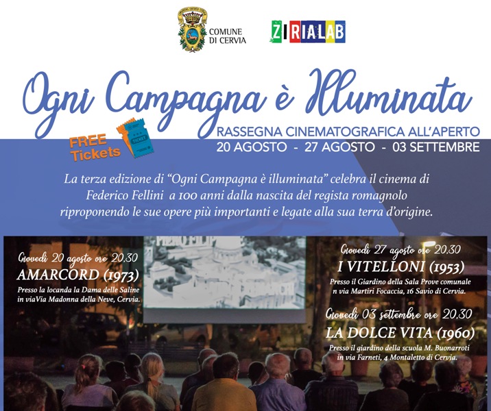 La rassegna continuerà con altre 2 date: il 27 agosto a Savio di Cervia nel giardino della sala prove comunale in via Martiri Focaccia. Verrà proiettato il film I Vitelloni, pellicola del 1953 e il 3 settembre a Montaletto nel giardino della scuola Buonarroti in via Farneti 4 con il film La Dolce Vita del 1960. Tutte le proiezioni sono programmate per le ore 20.30