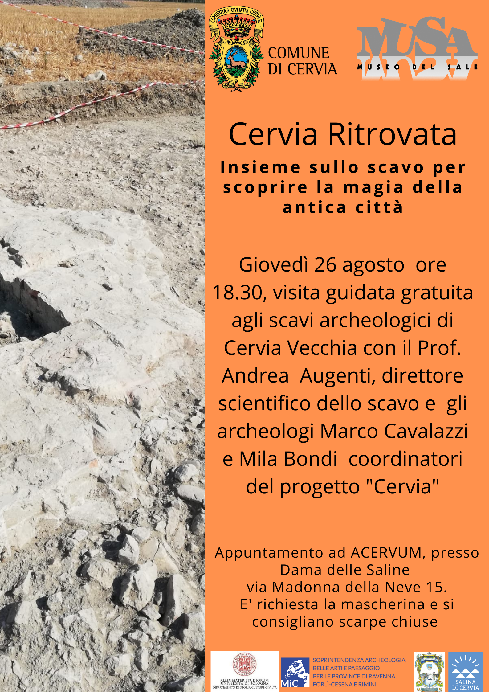 Per offrire ai cittadini e alle persone interessate la visione e la spiegazione delle attività svolte e delle prime novità emerse durante la campagna di scavo il Comune di Cervia organizza una visita guidata gratuita al sito archeologico per giovedì 26 agosto alle ore 18.30. Appuntamento ad Acervum, presso la Dama delle Saline in via Madonna della Neve 15. Condurranno la guida il prof. Andrea Augenti, direttore scientifico dello scavo, Mila Bondi e Marco Cavalazzi coordinatori del progetto. Non è necessaria la prenotazione ma occorre indossare la mascherina.